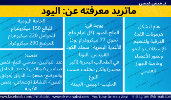 Read moreفي البطاقة معلومات حول مصادر اليود وماهي الأمور التي تسبب نقصه. في هذا المنشور معلومات إضافية عن المذكور في البطاقة حول اليود: 1- أعراض نقصه: نقصه يؤدي إلى ضخامة الدرق goitre ونقص نشاط الغدة الدرقية hypothyroidism الأعراض: تورم في الرقبة